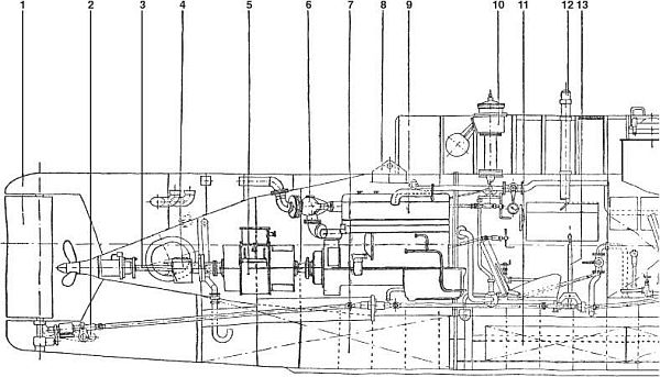 7 цистерны главного балласта; 2 диффе-рентные цистерны; 3 уравнительная цистерна; 4 палубные цистерны; 5 цистерна плавучести; 6 прочная рубка; 7 торпедный аппарат; 8 перископ; 9 дизельный двигатель; 10 гребной электродвигатель; 11 аккумуляторная батарея
